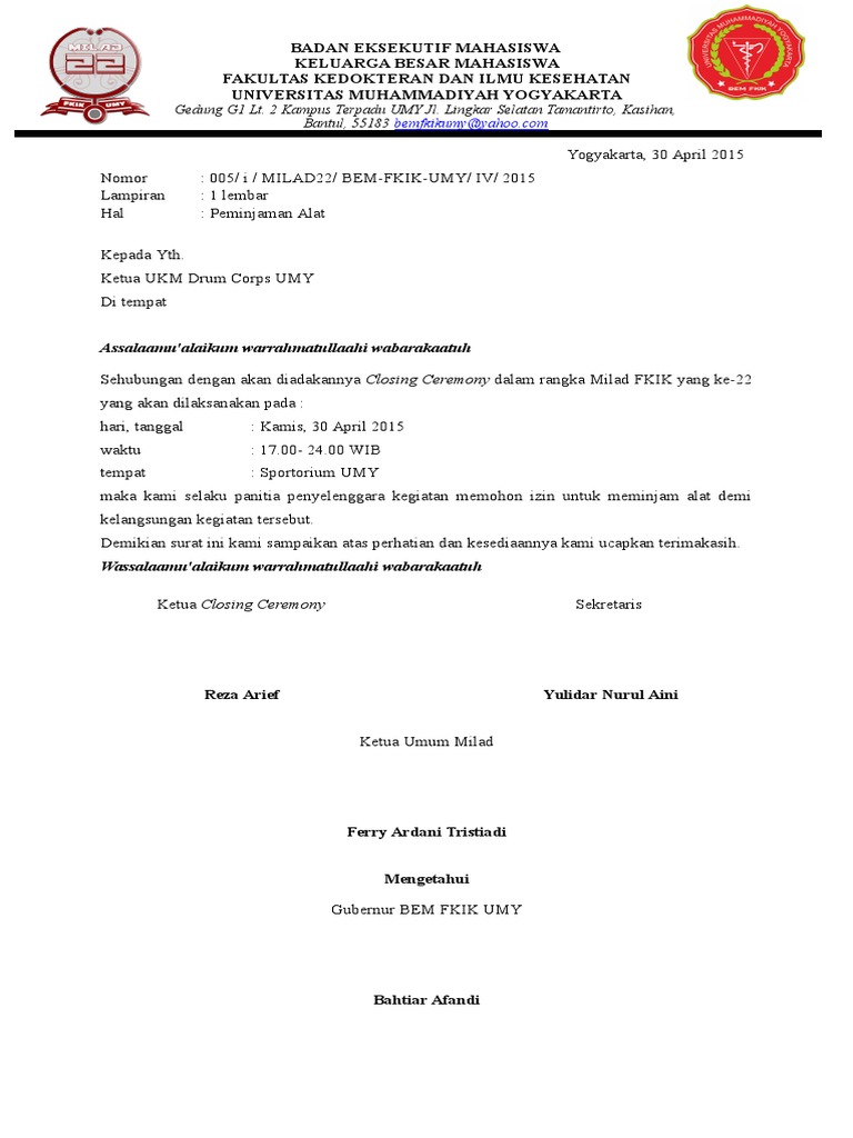 Contoh Surat Peminjaman Sarana Perlengkapan Seminan Himpunan Mahasiswa